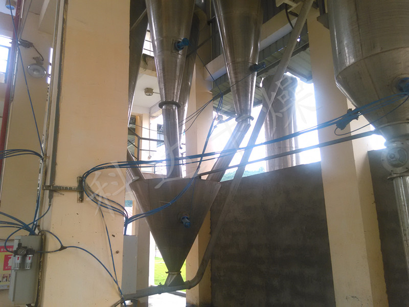 干燥流程完成后,干燥產(chǎn)品懸浮在空氣中,對離開干燥室的空氣中所帶出的干燥產(chǎn)品,一定要有效地加以分散及收回;以保證干燥流程能求得最高產(chǎn)量和防止粉料逸到高氣中造成空氣污染。本機使用一次性收料系統(tǒng)。干成品與空氣的混合物由內(nèi)置旋風(fēng)分散后使產(chǎn)品從干燥室底部出來后降落到振動冷卻收料器(冷卻效率≤75)部分產(chǎn)品進入旋風(fēng)分散器,由分散后,成品干粉經(jīng)設(shè)在旋風(fēng)分散器下部收料筒收集,含有少量微塵的廢氣從旋風(fēng)分散器上部出來后進入濕式除塵器,由除塵凈化后經(jīng)排風(fēng)機由煙囪排入高氣(需安裝冷凝段)